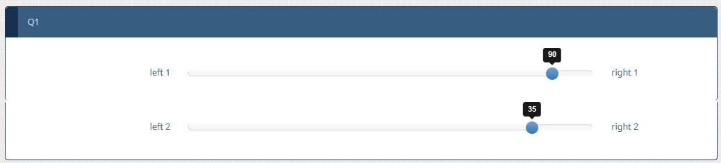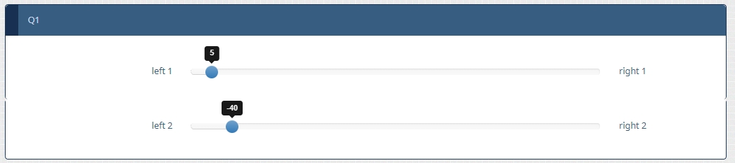 I'm trying to implement a question on my survey that has two sliders (via Multiple Numerical Input and subquestions). Right now, they're both from a range from -50 to 50, and everything works great. However, I'd like to make it so that one is from -50 to 50 and the other is 0 to 100. Is this possible to do in Limesurvey within a question? The survey is presented question by question.