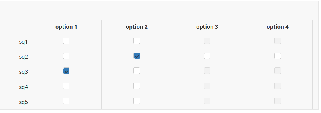 <script type="text/javascript" data-author="Tony Partner"> $(document).on('ready pjax:scriptcomplete',function(){ var thisQuestion = $('#question{QID}') // Add some classes to the checkbox cells // 3rd children (answer column 2) $('td.checkbox-item:nth-child(3)', thisQuestion).addClass('exclusive-item'); // 4th and above children (answer columns greater than 2) $('td.checkbox-item:nth-child(n+4)', thisQuestion).addClass('excluded-item'); // A listener on the exclusive checkboxes $('.exclusive-item input:checkbox', thisQuestion).on('change', function (event) { handleExclusive($(this)); }); // Returning to page $('.exclusive-item input:checkbox', thisQuestion).each(function (i) { handleExclusive($(this)); }); function handleExclusive(thisInput) { var thisCell = $(thisInput).closest('td'); var thisRow = $(thisCell).closest('tr'); if(thisInput.is(':checked')) { // Enable the excluded checkboxes $('.excluded-item input:checkbox', thisRow).prop('disabled', false); } else { // Uncheck the excluded boxes in a row $('.excluded-item input[type="hidden"]', thisRow).val(''); $('.excluded-item input:checkbox', thisRow).prop('checked', false).trigger('change').prop('disabled', true); } } }); </script>