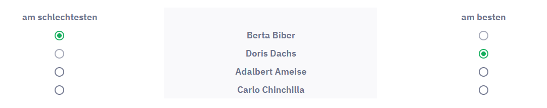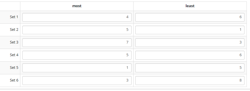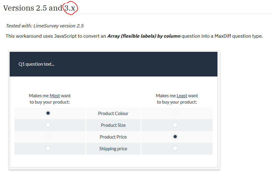 <script type="text/javascript" charset="utf-8"> function maxDiff(qID, randomize) { // Identify some elements var thisQuestion = $('#question'+qID); var thisTable = $('table.subquestion-list:eq(0)', thisQuestion); // Assign a new question class $(thisQuestion).addClass('max-diff-array'); // Move the columns $('thead tr:eq(0)', thisTable).prepend($('thead tr:eq(0) th:eq(1)', thisTable)); $('tr.answers-list', thisTable).each(function(i){ $('td.answer-item:eq(0)', this).prependTo(this); }); // Random rows if(randomize) { var rowsArr = ; $('tr.answers-list', thisTable).each(function(i){ $(this).attr('data-index', i); rowsArr.push(i); }); shuffleArray(rowsArr); $(rowsArr).each(function(i){ $('tbody', thisTable).append($('tr[data-index="'+this+'"]', thisTable)); }); } // Prevent clicking twice in the same row $('input[type="radio"]', thisQuestion).on('click', function () { $('input[type="radio"]', thisQuestion).prop('disabled', false); $('input[type="radio"]:checked', thisQuestion).each(function(i) { var thisRow = $(this).closest('tr.answers-list'); $('input[type="radio"]', thisRow).not(this).prop('disabled', true); }); }); // Fix up the row classes var rowClass = 1; $('tr.answers-list', thisTable).each(function(i) { $(this).addClass('array'+(2-(i%2))); }); } function shuffleArray(array) { for (var i = array.length - 1; i > 0; i--) { var j = Math.floor(Math.random() * (i + 1)); var temp = array[i]; array[i] = array[j]; array[j] = temp; } return array; } $(document).ready(function(){ // Call the maxDiff() function // Set the second parameter to true for randomized rows maxDiff({QID}, true); }); </script> <style type="text/css">.ls-answers tbody .answertext { text-align: center; } </style>[/i][/i]