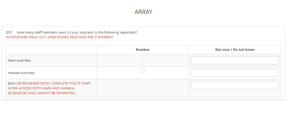 <script type="text/javascript" data-author="Tony Partner"> $(document).on('ready pjax:scriptcomplete',function(){ // Identify the questions var thisQID = {QID}; var thisQuestion = $('#question'+thisQID); var textQuestion = thisQuestion.nextAll('.multiple-short-txt:eq(0)'); var textQID = textQuestion.attr('id').replace(/question/, ''); // Hide the text question textQuestion.hide(); // Remove all radios from first column $('.answer-item:nth-child(2)', thisQuestion).removeClass('radio-item').addClass('text-item'); $('.answer-item:nth-child(2) :radio', thisQuestion).remove(); // Move the text inputs $('tr.answers-list', thisQuestion).each(function(i) { var thisCode = $(this).attr('id').split('X'+thisQID)[1]; $('.answer-item:nth-child(2)', this).append($(':text[id$="X'+textQID+thisCode+'"]', textQuestion)); }); // Listener on the radios $('.radio-item :radio', thisQuestion).on('click', function(e) { $(this).closest('tr').find(':text').val('').trigger('keyup'); }); // Listener on the text inputs $('.text-item :text', thisQuestion).on('keyup change', function(e) { if($.trim($(this).val()) != '') { var thisRadio = $(this).closest('tr').find(':radio:first'); $(thisRadio).prop('checked', false); checkconditions('', $(thisRadio).attr('name'), 'radio'); } }); }); </script>