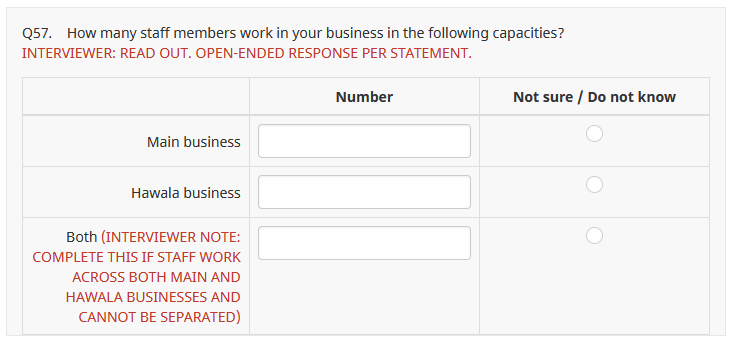 <script type="text/javascript" data-author="Tony Partner"> $(document).on('ready pjax:scriptcomplete',function(){ // Identify the questions var thisQID = {QID}; var thisQuestion = $('#question'+thisQID); var textQuestion = thisQuestion.nextAll('.multiple-short-txt:eq(0)'); var textQID = textQuestion.attr('id').replace(/question/, ''); // Hide the text question textQuestion.hide(); // Remove all radios from first column $('.answer-item:nth-child(2)', thisQuestion).removeClass('radio-item').addClass('text-item'); $('.answer-item:nth-child(2) :radio', thisQuestion).remove(); // Move the text inputs $('tr.answers-list', thisQuestion).each(function(i) { var thisCode = $(this).attr('id').split('X'+thisQID)[1]; $('.answer-item:nth-child(2)', this).append($(':text[id$="X'+textQID+thisCode+'"]', textQuestion)); }); }); </script>