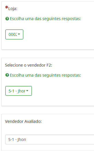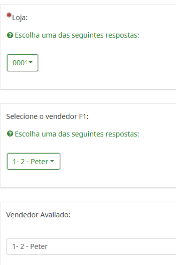 ==================Hello friends,Firstly, I would like to thank you immensely for the work done at LimeSurvey, the world is a better place thanks to you. I have managed to get along well with the forums, but I have a problem with an expression that I am unable to overcome, so I humbly ask for your help. Every help is welcome. Details below. I have a survey to evaluate performance, where the user must first select the store (G01Q16) and, depending on the store chosen, the next question will be displayed (G01Q15 or G01Q19) containing only sellers who belong to the selected store. Then the user selects the desired seller. So far everything works fine. My next objective would be to obtain the selected seller and assign it to the Evaluated Seller question (G01Q11), which would obtain the selected seller regardless of the chosen store, with a function-type question with the following expression.