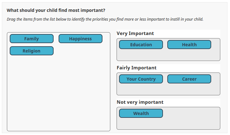 to achieve this you may use the plugin "cardSort"where I prompt survey respondents to categorize certain statements.