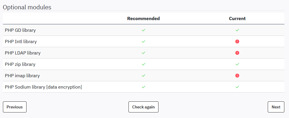 a couple of days ago I installed our first LS 6 CE. I recall having been warned about two optional PHP libraries being missing, but since they were optional I went on with the installation. Now I would like to "perfect" the installation by installing the optional PHP libraries. Is there a way to track down which they were?