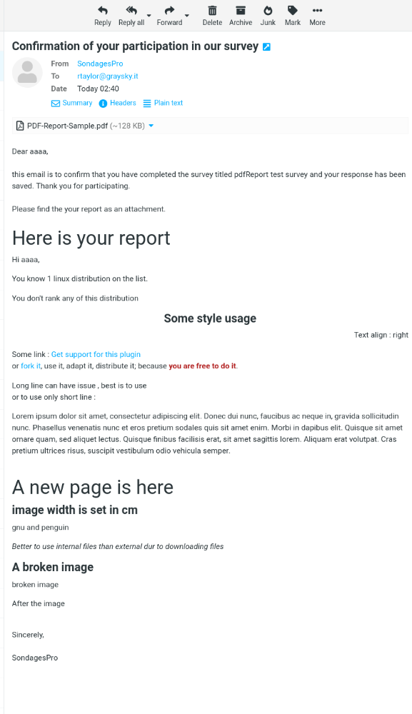 * Not include the pdf report in the body of the email, only a confirmation text + an attachment.