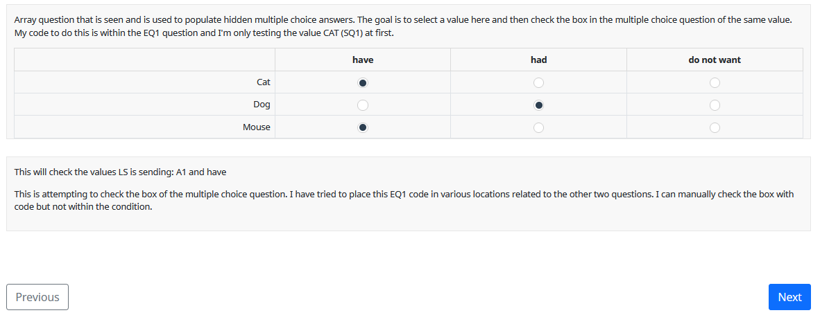 NOW my next step is to use this MC as a hidden question and I am ATTEMPTING to set its checked values based on an Array Question