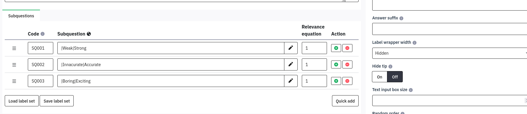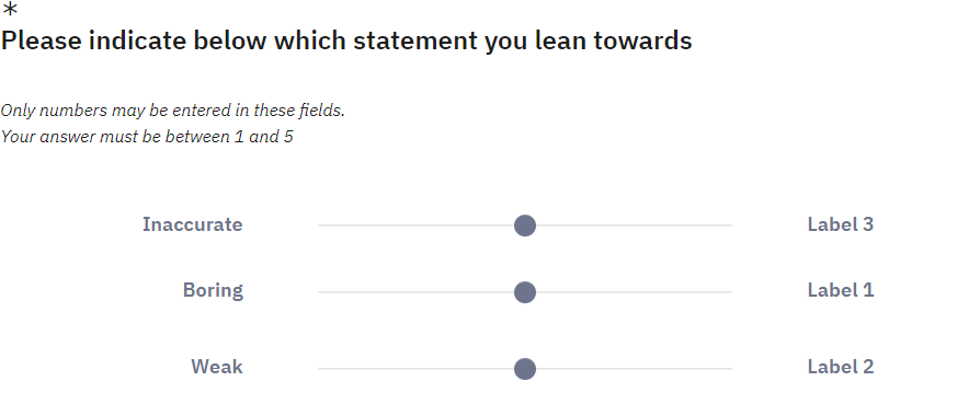 // Label 1 var label1 = $('<label class="col-12 col-md-3 slider-right">Label 1</label>'); $('#javatbd{SID}X{GID}X{QID}1 .ls-slider-item-row').append(label1); $('#label-{SID}X{GID}X{QID}1').removeClass('col-md-4').addClass('col-md-3 mb-0'); $('#javatbd{SID}X{GID}X{QID}1 .px-md-5').removeClass('col-md-8').addClass('col-md-6'); // Label 2 var label2 = $('<label class="col-12 col-md-3 slider-right">Label 2</label>'); $('#javatbd{SID}X{GID}X{QID}2 .ls-slider-item-row').append(label2); $('#label-{SID}X{GID}X{QID}2').removeClass('col-md-4').addClass('col-md-3 mb-0'); $('#javatbd{SID}X{GID}X{QID}2 .px-md-5').removeClass('col-md-8').addClass('col-md-6'); // Label 3 var label3 = $('<label class="col-12 col-md-3 slider-right">Label 3</label>'); $('#javatbd{SID}X{GID}X{QID}3 .ls-slider-item-row').append(label3); $('#label-{SID}X{GID}X{QID}3').removeClass('col-md-4').addClass('col-md-3 mb-0'); $('#javatbd{SID}X{GID}X{QID}3 .px-md-5').removeClass('col-md-8').addClass('col-md-6');