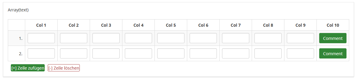 And this - www.limesurvey.org/manual/Workarounds:_M...meSurvey_version_6.xWould it also be possible to implement a flexible text array (dynamic rows)? Adding/Removing visibility of each row