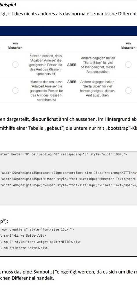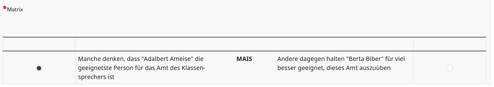 I also tried the Liste (Radio) option with answers in columns, but here I would need to have the 'but' central, hide the button of 'mais' (it is not supposed to be an answer option), and I do not know how to do this.
