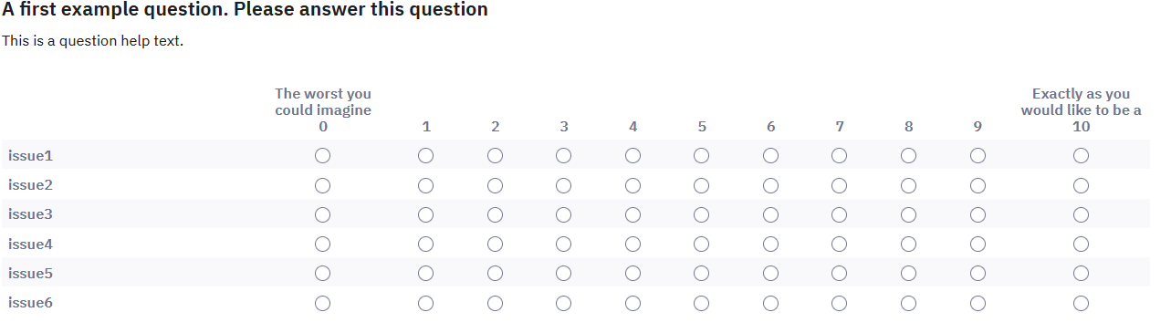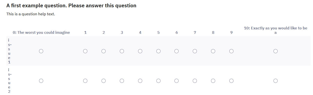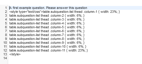 <style type="text/css">table.subquestion-list col { width: auto !important; } .custom-array table.subquestion-list thead .column-0 { width: 22%; } .custom-array table.subquestion-list thead .column-1 { width: 12%; } .custom-array table.subquestion-list thead .column-2 { width: 6%; } .custom-array table.subquestion-list thead .column-3 { width: 6%; } .custom-array table.subquestion-list thead .column-4 { width: 6%; } .custom-array table.subquestion-list thead .column-5 { width: 6%; } .custom-array table.subquestion-list thead .column-6 { width: 6%; } .custom-array table.subquestion-list thead .column-7 { width: 6%; } .custom-array table.subquestion-list thead .column-8 { width: 6%; } .custom-array table.subquestion-list thead .column-9 { width: 6%; } .custom-array table.subquestion-list thead .column-10 { width: 6%; } .custom-array table.subquestion-list thead .column-11 { width: 12%; } </style>