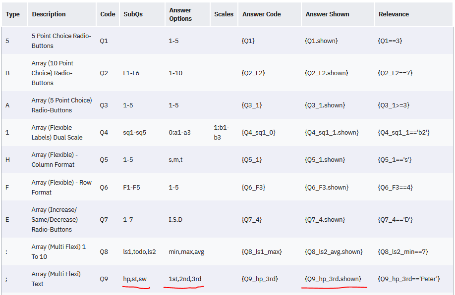 c. Q3fA3 is not a real QCODE. Q3f is an array(numbers); you have to address both dimensions of subquestions. So the QCODE consists of QUESTIONCODE_SUBQUESTIONCODE-Y_SUBQUESTIONCODE-X.