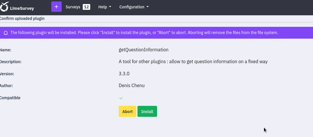 Then you didn't get it via dl.sondages.pro : I test directly this one.Edit: I be able to install it, but i have to download the zip, unzip it, take the content out of the main folder where is located and create the same zip with the files directly, what was happening was that the plugin was trying to be installed in a loop folder, i mean it was creating 2 folders like this "getQuestionInformation-master" then another "getQuestionInformation-master" and then the files of the plugin.