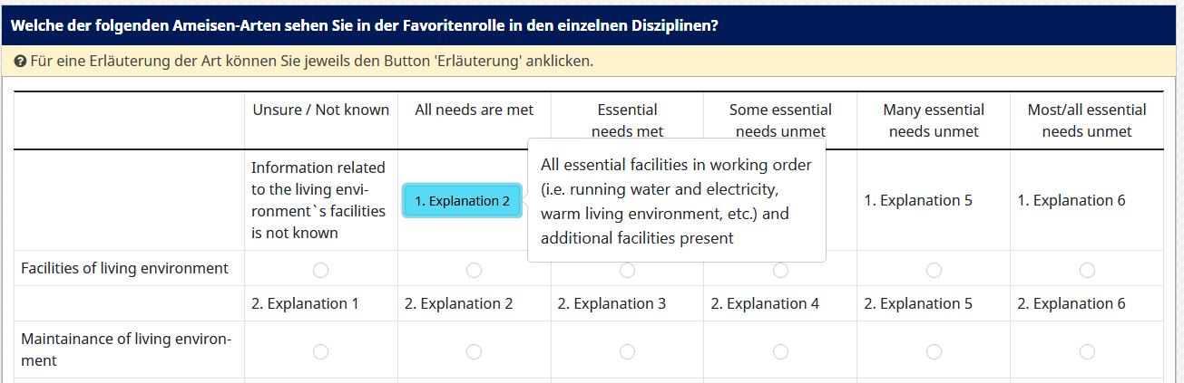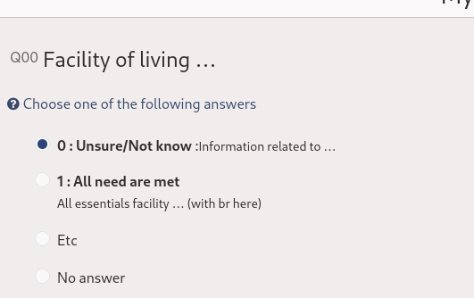 I could separate them out into 3 separate choice questions, but that still doesn't fix my issue. I still need to add descriptors so that the individual has context for what is a 0, in comparison to a 5 (for instance). The descriptor text has important information to help the individual decide where it sits on the 0-5. Each descriptor is different. I need to know if there is a question format which will allow me to use this style. I'll attached a copy of my descriptors in an image for context.