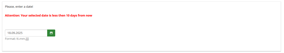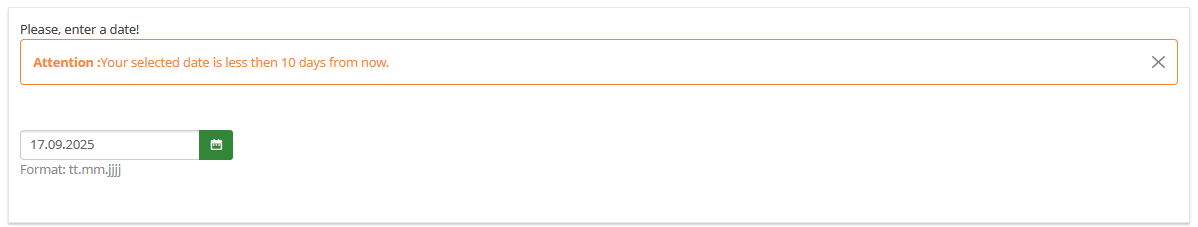 {if(!is_empty(self) and (strtotime(self)-strtotime(date('Y-m-d')))<864000,'<div class="alert alert-warning alert-dismissible fade show" role="alert"><strong>Attention :</strong> Your selected date is less then 10 days from now<button type="button" class="btn-close" data-bs-dismiss="alert" aria-label="Close"></button></div>','')}