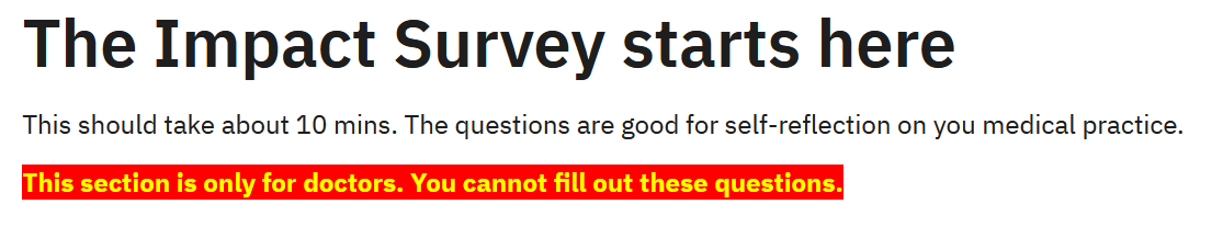 <script type="text/javascript"> $(document).ready(function() { if ((G1Q00001 == "N")) { // Check if the respondent is not a professional $('input, select, textarea').prop('disabled', true); // Disable all input fields } }); </script>