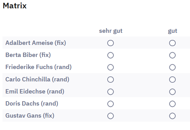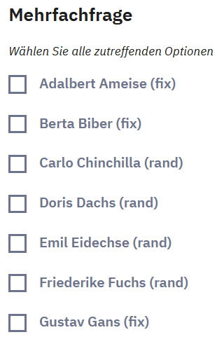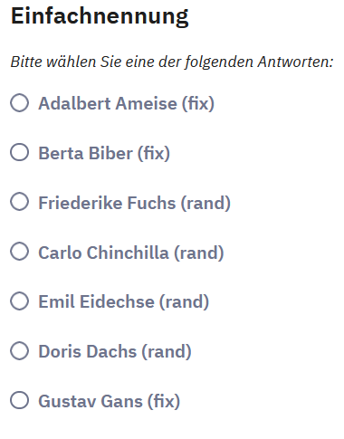 <script type="text/javascript" charset="utf-8"> function shuffle(array) { var currentIndex = array.length, temporaryValue, randomIndex; // While there remain elements to shuffle... while (0 !== currentIndex) { // Pick a remaining element... randomIndex = Math.floor(Math.random() * currentIndex); currentIndex -= 1; // And swap it with the current element. temporaryValue = array[currentIndex]; array[currentIndex] = array[randomIndex]; array[randomIndex] = temporaryValue; } return array; } $(document).on('ready pjax:scriptcomplete',function(){ // Fill the arrays var arrTopFix = [1,2] ; var arrRand = [3,4,5,6]; var arrBottomFix = [7] ; var arrTotal = ; arrTopFix = arrTopFix.join(','); arrRand = shuffle(arrRand).join(',');; arrBottomFix = arrBottomFix.join(','); arrTotal=arrTopFix.concat(',',arrRand,',',arrBottomFix); $('#question{QID} input[type="text"]').val(arrTotal); // Nach dem Testen in dieser letzten Zeile die Schrägstriche entfernen //$('#question{QID}').hide(); }); </script>
