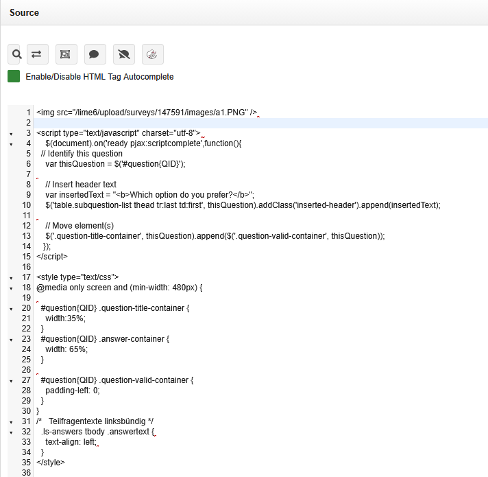 <script type="text/javascript" charset="utf-8"> $(document).on('ready pjax:scriptcomplete',function(){ // Identify this question var thisQuestion = $('#question{QID}'); // Insert header text var insertedText = "<b>Which option do you prefer?</b>"; $('table.subquestion-list thead tr:last td:first', thisQuestion).addClass('inserted-header').append(insertedText); // Move element(s) $('.question-title-container', thisQuestion).append($('.question-valid-container', thisQuestion)); }); </script>