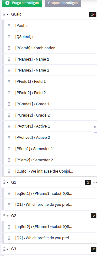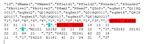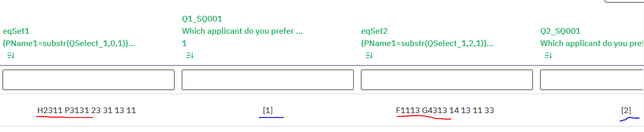 {PName1=substr(QSelect_1,2,1)} {PComb_1=substr(Pool,strpos(Pool,join(substr(QSelect_2,6,3),':'))+4,4)} {PName2=substr(QSelect_1,3,1)} {PComb_2=substr(Pool,strpos(Pool,join(substr(QSelect_2,9,3),':'))+4,4)} {PField1=substr(PComb_1,0,1)} {PField2=substr(PComb_2,0,1)} {PGrade1=substr(PComb_1,1,1)} {PGrade2=substr(PComb_2,1,1)} {PActive1=substr(PComb_1,2,1)} {PActive2=substr(PComb_2,2,1)} {PSem1=substr(PComb_1,3,1)} {PSem2=substr(PComb_2,3,1)}