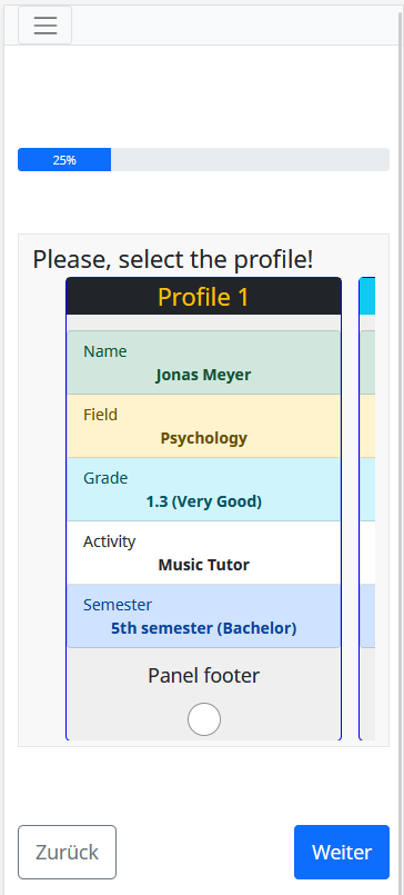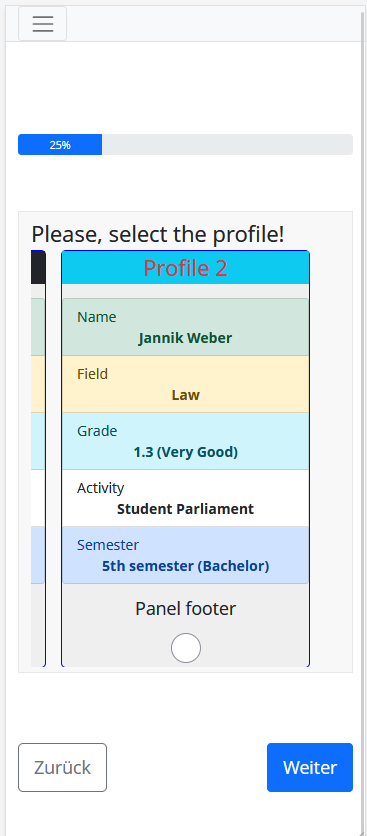 <table border="1" cellpadding="0" cellspacing="0" style="border-collapse:collapse;" width="100%"> <tbody> <tr> <td>Which profile do you prefer?</td> <td><strong>Profile 1</strong></td> <td><strong>Profile 2</strong></td> </tr> <tr> <td>Name</td> <td><strong>{PName1.shown}</strong></td> <td><strong>{PName2.shown}</strong></td> </tr> ... <tr> <td>Semester</td> <td><strong>{PSem1.shown}</strong></td> <td><strong>{PSem2.shown}</strong></td> </tr> <tr> <td><b>Your choice</b></td> <td> </td> <td> </td> </tr> </tbody> </table>