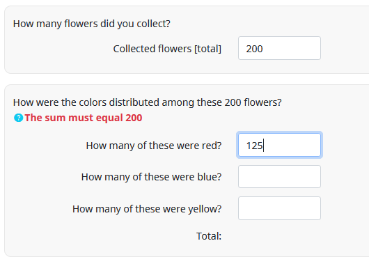 <p style="color:red;font-weight:bold">{if(count(self)==4 and Q2_1!=sum(Q2_2,Q2_3,Q2_4),'sum of flowers ('+sum(Q2_2,Q2_3,Q2_4)+') do not add up to total sum of flowers ('+Q2_1+')','')}</p>