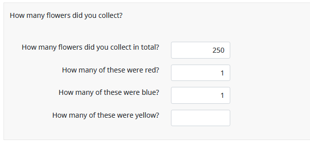 1. One question to collect the total (Q1a), one question to collect the colors.(Q1b)