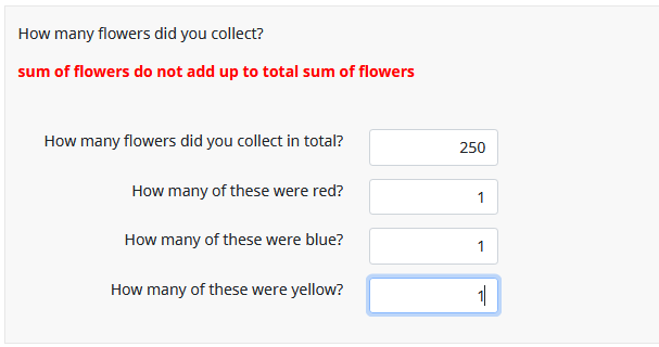<p style="color:red;font-weight:bold">{if(count(self)==4 and Q2_1!=sum(Q2_2,Q2_3,Q2_4),'sum of flowers do not add up to total sum of flowers','')}</p>