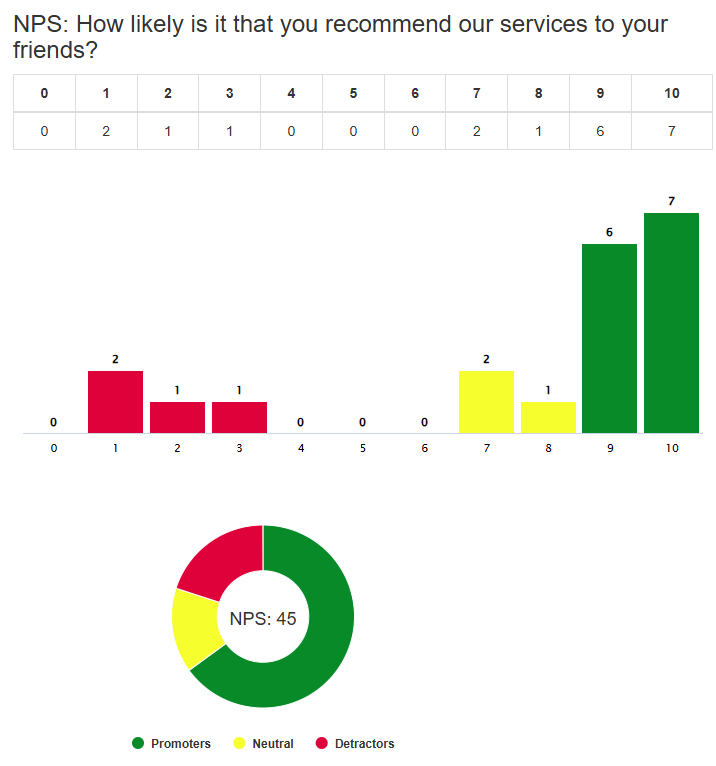 – built-in evaluation with automatic classification (Detractors, Passives, Promoters) and visual charts