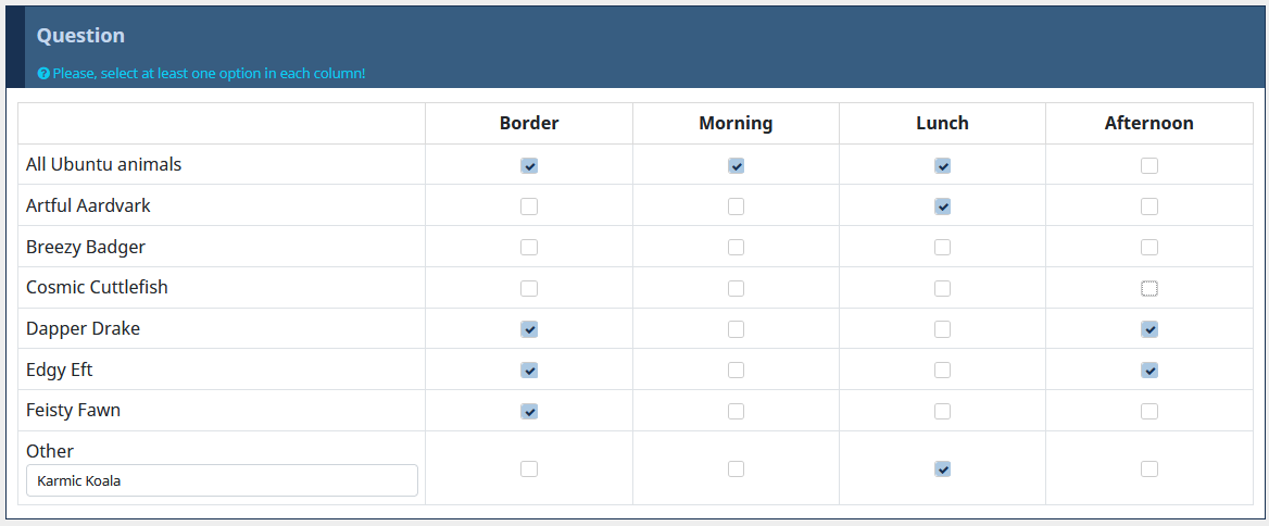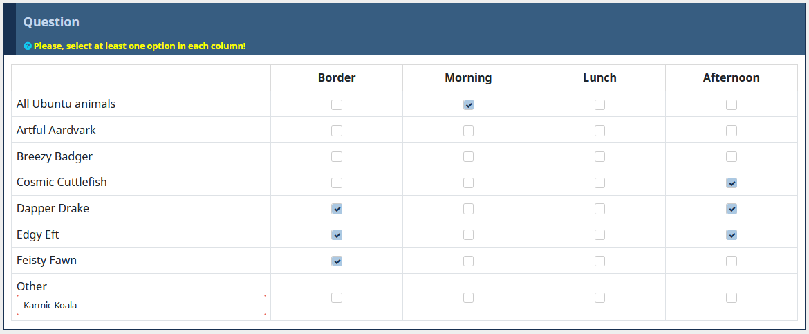 <script type="text/javascript" data-author="Tony Partner"> $(document).on('ready pjax:scriptcomplete',function(){ // Identify this question var thisQuestion = $('#question{QID}'); // Identify the exclusive row var thisTable = $('table.subquestion-list', thisQuestion); var exclusiveRow = $('tr[id^="javatbd"]:last', thisTable); $(exclusiveRow).addClass('exclusive-row'); // Listener on the checkboxes $(':checkbox', thisTable).on('change', function(event){ if($(this).is(':checked')) { var thisRow = $(this).closest('tr'); // Identify the column var thisIndex = $(this).closest('td').index(); // Identify the radios to be un-checked var excludedItems = $('tr.exclusive-row td.answer-item:nth-child('+(thisIndex+1)+')', thisTable); if($(thisRow).hasClass('exclusive-row')) { excludedItems = $('tr:not(.exclusive-row) td:nth-child('+(thisIndex+1)+')', thisTable); } // Un-check those checkboxes $.each(excludedItems, function(i, thisItem) { $('input[type="hidden"]', thisItem).val(''); $(':checkbox', thisItem).prop('checked', false).trigger('change'); }); } }); }); </script>