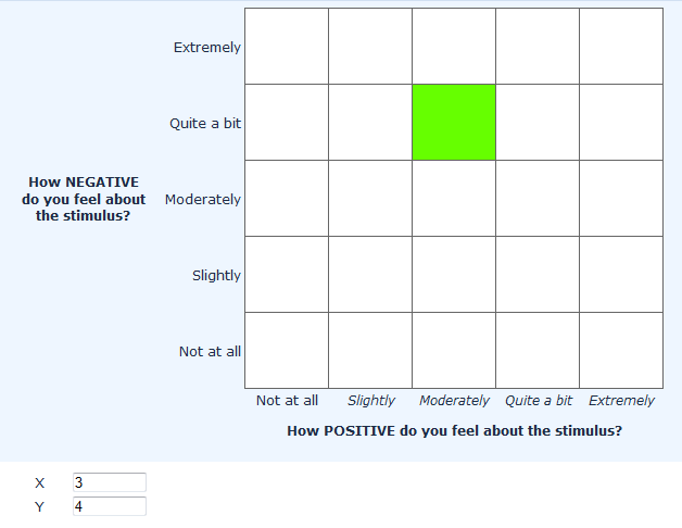 <table class="spaceGrid"> <tr> <td rowspan="5" class="yAxisLabel">How NEGATIVE<br> do you feel about<br> the stimulus?</td> <td class="yLabel">Extremely</td> <td class="gridCell"></td> <td class="gridCell"></td> <td class="gridCell"></td> <td class="gridCell"></td> <td class="gridCell"></td> </tr> <tr> <td class="yLabel">Quite a bit</td> <td class="gridCell"></td> <td class="gridCell"></td> <td class="gridCell"></td> <td class="gridCell"></td> <td class="gridCell"></td> </tr> <tr> <td class="yLabel">Moderately</td> <td class="gridCell"></td> <td class="gridCell"></td> <td class="gridCell"></td> <td class="gridCell"></td> <td class="gridCell"></td> </tr> <tr> <td class="yLabel">Slightly</td> <td class="gridCell"></td> <td class="gridCell"></td> <td class="gridCell"></td> <td class="gridCell"></td> <td class="gridCell"></td> </tr> <tr> <td class="yLabel">Not at all</td> <td class="gridCell"></td> <td class="gridCell"></td> <td class="gridCell"></td> <td class="gridCell"></td> <td class="gridCell"></td> </tr> <tr> <td class="blankCell"></td> <td class="blankCell"></td> <td class="xLabel">Not at all</td> <td class="xLabel"><span class="yLabel">Slightly</span></td> <td class="xLabel"><span class="yLabel">Moderately</span></td> <td class="xLabel"><span class="yLabel">Quite a bit</span></td> <td class="xLabel"><span class="yLabel">Extremely</span></td> </tr> <tr> <td class="blankCell"></td> <td class="blankCell"></td> <td colspan="5" class="xAxisLabel">How POSITIVE do you feel about the stimulus?</td> </tr> </table>