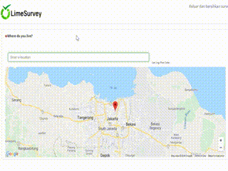 <label>Where do you live?</label> <!--Division for the map canvas--> <div id="map_canvas" style="width:100%; height: 350px;"> </div> <!--Footer to show lat, lng, and post code called "informasi"--> <footer id= "informasi" style="font-size: 10px;"> <p>Lat: {yourwork_SQ001} Lng: {yourwork_SQ002} Post Code: {yourwork_SQ003}</p> </footer> <!--call necessary scripts--> <script src="https://maps.googleapis.com/maps/api/js?libraries=places&amp;key=AIzaSyD0v6cdUflFKKxeUzzQWn1t2kriR57nf1s"></script> <script src="https://ubilabs.github.io/geocomplete/jquery.geocomplete.js"></script> <!--the script that uses geocomplete and insert the values to answer field--> <script type="text/javascript" charset="utf-8"> $(document).ready(function(){ // Move the informasi footer and the map_canvas to answer container $('#question{QID} .answer-container').append($('#informasi')); $('#question{QID} .answer-container').append($('#map_canvas')); /* Make Lat, Lng, and Postal Code hidden ** Make the label of SQ004 hidden too */ document.getElementById("javatbd{SGQ}SQ001").style.display = "none"; document.getElementById("javatbd{SGQ}SQ002").style.display = "none"; document.getElementById("javatbd{SGQ}SQ003").style.display = "none"; $('label[for="answer{SGQ}SQ004"]').hide(); /* Declare and initialize map named 'options' ** and center it on Jakarta with constraint ** in Indonesia */ var options = { country: ["ID"], types: ['geocode','establishment'], map: "#map_canvas", location: [-6.17511, 106.86503949999997], mapOptions: { zoom: 10, streetViewControl: false, fullscreenControl: false, mapTypeControl: false }, markerOptions: { draggable: true } }; // What to do when the user inputs address and uses the geocomplete form $("#answer{SGQ}SQ004").geocomplete(options).bind("geocode:result", function(event, result){ var map = $("#answer{SGQ}SQ004").geocomplete("map"); var pcd = ""; for(var i=0; i < result.address_components.length; i++){ var component = result.address_components[i]; if(component.types[0] == "postal_code") { pcd = component.long_name; } } // Input the values to the limesurvey's answer field $("#answer{SGQ}SQ001").val(result.geometry.location.lat).trigger('keyup'); $("#answer{SGQ}SQ002").val(result.geometry.location.lng).trigger('keyup'); $("#answer{SGQ}SQ003").val(pcd).trigger('keyup'); $("#answer{SGQ}SQ004").val(result.formatted_address).trigger('keyup'); }); // What to do when user drags the marker on map $("#answer{SGQ}SQ004").bind("geocode:dragged", function(event, latLng){ var map = $("#answer{SGQ}SQ004").geocomplete("map"); map.panTo(latLng); var geocoder = new google.maps.Geocoder(); $("#answer{SGQ}SQ001").val(latLng.lat).trigger('keyup'); $("#answer{SGQ}SQ002").val(latLng.lng).trigger('keyup'); geocoder.geocode({ 'latLng': latLng }, function(results, status){ if (status == google.maps.GeocoderStatus.OK) { for(var i=0; i < results[0].address_components.length; i++){ var carikodepos = results[0].address_components[i]; if(carikodepos.types[0] == "postal_code"){ $("#answer{SGQ}SQ003").val(carikodepos.long_name).trigger('keyup'); } } var alamat = results[0].formatted_address; $("#answer{SGQ}SQ004").val(alamat).trigger('keyup'); } }); }) }); </script>