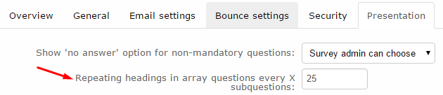I am currently trying to do the same as ttophen and cannot find an option for "Repeating headings in array questions every X subquestions" in "General Setting - Presentation and Navigation". Has this moved somewhere? I'm using v2.0