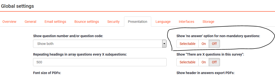 KompetenzZ wrote: Last year when I used LimeSurvey in Version 2.6+ there was this "show 'no answer'" button in the presentation and navigation tab of the general settings, which can be deactivated. However, in Version 3.14 some things changed.