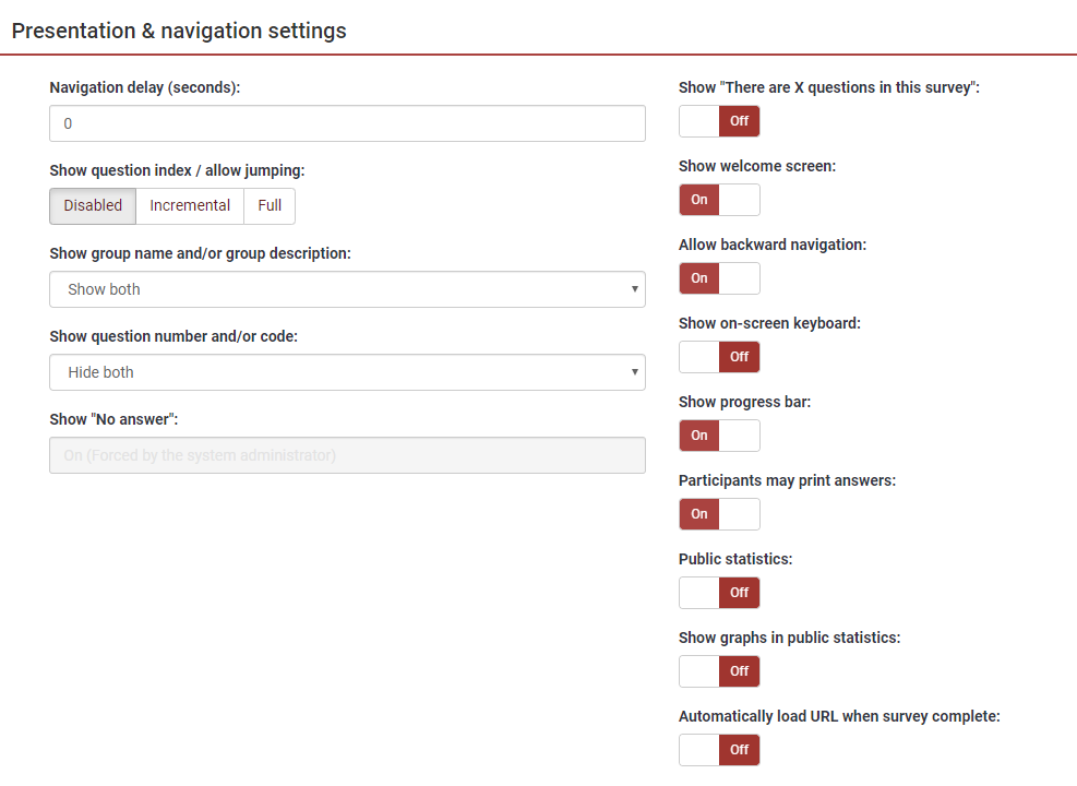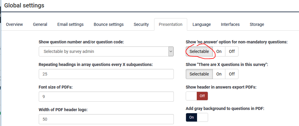 If you choose "selectable" in the global settings. If you choose On or Off it is geyed out on the survey level.tpartner wrote: You can also do it at the survey level.