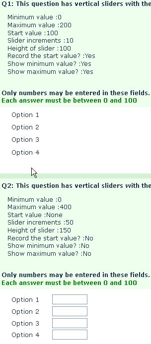 $(document).ready(function(){ // Call the vertical slider plugin with the question ID // Edit options here as desired $('#questionQQ').lsVerticalSlider({ minValue :0, // Minimum value (default 0) maxValue :200, // Maximum value (default 100) startValue :100, // Start value (default null) step :10, // Slider increments (default 1) height :100, // Height of slider in pixels (default 200) recordStart :true, // Record the start value? (default no) showMin :true, // Show minimum value? (default no) showMax :true // Show maximum value? (default no) }); }); // NO EDITING REQUIRED BELOW HERE // A jQuery plugin to convert multiple-numeric questions to vertical sliders (function( $ ){ $.fn.lsVerticalSlider = function(options) { // The defaults, extended and modified with any passed in the function call var opts = $.extend( { minValue :0, maxValue :100, startValue :'', step :1, height :150, recordStart :false, showMin :false, showMax :false }, options); return this.each(function() { var $this = $(this); // Some classes for the question and sub-questions $this.addClass('vertical-slider-question'); $('li:[id^="javatbd"]', $this).addClass('vertical-slider-sub-question'); // Loop through the sub-questions $('li:[id^="javatbd"]', $this).each(function(i){ var itemID = $(this).attr('id').replace(/javatbd/, ''); // Check for pre-existing answer if($('#answer'+itemID).val() != '') { opts.startValue = $('#answer'+itemID).val(); } // Insert the slider elements $('#answer'+itemID).after( '<div class="vertical-slider-max-min" style="height:'+(opts.height+2)+'px;"> \ <div class="vertical-slider-max"></div> \ <div class="vertical-slider-min"></div> \ </div> \ <div id="vertical-slider-'+itemID+'" class="vertical-slider" style="height:'+opts.height+'px;"></div> \ <div class="vertical-slider-callout-wrapper" style="height:'+(opts.height+2)+'px;"> \ <div class="vertical-slider-callout" id="slider-callout-'+itemID+'"></div> \ </div>' ); // Show min/max if option is set if(opts.showMax) { $('.vertical-slider-max', $this).text(opts.maxValue); } if(opts.showMin) { $('.vertical-slider-min', $this).text(opts.minValue); } // Initiate the slider $('#vertical-slider-'+itemID).slider({ orientation: 'vertical', range: 'min', min: opts.minValue, max: opts.maxValue, value: opts.startValue, step: opts.step, slide: function(event, ui) { $('#answer'+itemID).val(ui.value); $('#slider-callout-'+itemID).text(ui.value); setTimeout(function() { $('#slider-callout-'+itemID).css({ 'bottom':$('#vertical-slider-'+itemID+' .ui-slider-handle').css('bottom') }).show(); }, 10); }, create: function(event, ui) { // Initial values and positions if($('#answer'+itemID).val() != '') { // Pre-existing answer $('#slider-callout-'+itemID).text(opts.startValue); } else if(opts.recordStart) { // Record the start value (if option is set) $('#answer'+itemID).val(opts.startValue); $('#slider-callout-'+itemID).text(opts.startValue); } else { $('#slider-callout-'+itemID).hide(); } $('#slider-callout-'+itemID).css({ 'bottom':$('#vertical-slider-'+itemID+' .ui-slider-handle').css('bottom') }); } }); }); }); }; })( jQuery );