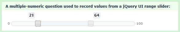 <script type="text/javascript" charset="utf-8"> $(document).ready(function(){ $('#question{QID}').lsRangeSlider({ sliderMin :0, // Minimum slider value (default 0) sliderMax :100, // Maximum slider value (default 100) rangeStartMin :20, // Minimum range handle start value rangeStartMax :80, // Maximum range handle start value minRangeSpan :5, // Minimum allowed range span step :1, // Slider increments (default 1) width :400, // Width of slider in pixels (default 250) recordStart :true, // Record the start value? (default no) showMin :true, // Show slider minimum value? (default no) showMax :true // Show slider maximum value? (default no) }); }); </script>