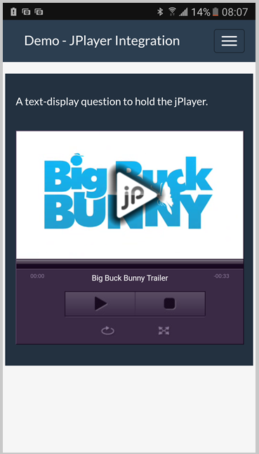 <script type="text/javascript"> $(document).ready(function(){ var thisQuestion = $('#question{QID}'); function resizePlayer() { var playerWidth = $('#jquery_jplayer_{QID}').width(); var aspectRatio = { 'width': 16, 'height': 9 }; var playerHeight = (playerWidth*aspectRatio.height)/aspectRatio.width; $('#jquery_jplayer_{QID}').css('height', playerHeight+'px'); $('#jquery_jplayer_{QID} img').css('height', playerHeight+'px'); $('#jp_container_{QID} .jp-video-play').css({ 'height': playerHeight+'px', 'margin-top': '-'+playerHeight+'px' }); } $(window).resize(function() { resizePlayer(); }); $('#jquery_jplayer_{QID}').jPlayer({ ready: function () { resizePlayer(); $(this).jPlayer("setMedia", { title: "Big Buck Bunny Trailer", m4v: "https://www.jplayer.org/video/m4v/Big_Buck_Bunny_Trailer.m4v", ogv: "https://www.jplayer.org/video/ogv/Big_Buck_Bunny_Trailer.ogv", poster: "https://www.jplayer.org/video/poster/Big_Buck_Bunny_Trailer_480x270.png" }); }, cssSelectorAncestor: "#jp_container_{QID}", swfPath: "{TEMPLATEURL}scripts/jPlayer-2.9.2/dist/jplayer", supplied: "m4v, ogv", useStateClassSkin: true, autoBlur: false, smoothPlayBar: true, keyEnabled: true, remainingDuration: true, toggleDuration: true, size: { 'width': '100%', 'height': 'auto', 'cssClass': 'jp-video-ls' // Custom class for LimeSurvey } }); }); </script>