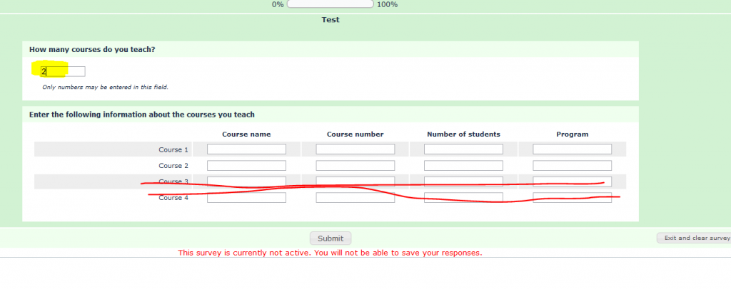 <script type="text/javascript" charset="utf-8"> $(document).ready(function(){ // Identify the questions var q1ID = '{QID}'; var q1 = $('#question'+q1ID+''); var q2 = $(q1).nextAll('.array-multi-flexi-text:eq(0)'); var q2ID = $(q2).attr('id').split('question')[1]; // Initial row handling handleRows($('input[type="text"]', q1)); // Listener on the numeric input $('input[type="text"]', q1).mouseup(function(){ var maxRows = $('tr:[id^="javatbd"]', q2).length; if($(this).val() > maxRows) { alert('You can only display a maximum of '+maxRows+' rows!'); $(this).val(''); } else { handleRows(this); } }); function handleRows(el) { var numRows = $(el).val(); $('tr:[id^="javatbd"]', q2).hide(); $('tr:[id^="javatbd"]', q2).each(function(i){ if(i >= numRows) { $('input[type="text"], select', this).val(''); } else { $(this).show(); } }) } // Interrupt next/submit function $('form#limesurvey').submit(function(){ // Load hidden inputs $('.subquestions-list tr:hidden input[type="text"]', q2).val('N/A'); // Carry on with submit return true; }); }); </script>