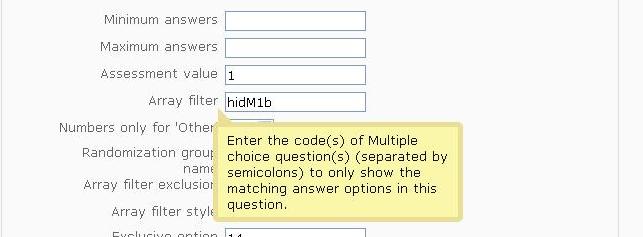 The array filter tool tip says "The tool tip says "Enter the code() of Mutiple choice question(s)(separated by semicolons) to only show the matching answer options in this question" . It would be very useful if it work the way as indicated by tool tip. But actually only question id are supported in this filed. Please let me know if here I can enter the comma separated codes as well.