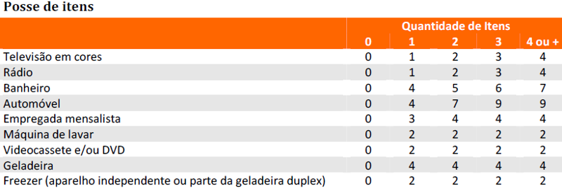 So what we do is to ask the number of color TVs, radios, bathrooms, cars, maids, washing machines, video recorders/DVD players, fridge and freezer. The scale is 0,1,2,3,4+. However, unfortunately some items get more points than others. So while for one TV set in your household you get 1 point, for the first bath room you'll get 4 points (for the following only one...).