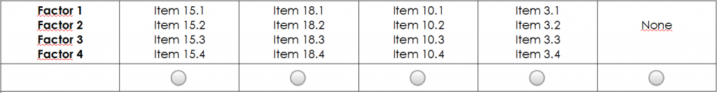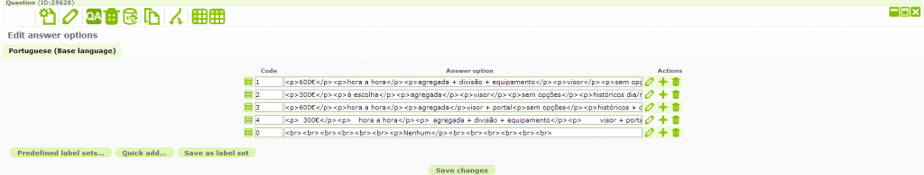 I'm implementing a CBC survey on LimeSurvey - so far, so good, with more or less difficulty I'm achieving what I need, after some layout issues I'm getting to the questions' content. What I'd like to do know (since I did not found anyone with similar doubts or anything related in the manual), is if it is possible to use a subset of predefined items (in this case, I have 4 profiles - i.e. 4 answer options - displayed in each array question, from a total of 18 - please see the image attached) in each question. Is this possible? If so, it would be much more easy & professional to edit each profile, instead of hard-writing it on a separate label set for each question.
