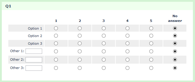 Code:<script type="text/javascript" charset="utf-8"> $(document).ready(function() { // Identify the questions var thisQuestion = $('#question'+{QID}+''); var nextQuestion1 = $(thisQuestion).nextAll('.text-short:eq(0)'); var nextQuestion2 = $(thisQuestion).nextAll('.text-short:eq(1)'); var nextQuestion3 = $(thisQuestion).nextAll('.text-short:eq(2)'); var nextQuestions = $(nextQuestion1).add(nextQuestion2).add(nextQuestion3); var nextLength = nextQuestions.length; var sqLength = ('tr.answers-list', thisQuestion).length; // Hide the short-text questions $(nextQuestions).hide(); // Move the hidden text inputs into the array for (i = 0; i < nextLength; i++) { var workingIndex = (sqLength - 1) - (nextLength - i); var nextQ = nextQuestions[i]; $('th.answertext:eq('+workingIndex+')', thisQuestion).closest('tr').addClass('otherRow').find('input.radio:eq(0)').after($('input[type="text"]', nextQ)); } // Some styling... $('input[type="text"]', thisQuestion).css({ 'width': '50%' }); // Handle the "Other" radios $('input[type="text"]', thisQuestion).on('keyup change',function(event){ event.stopPropagation(); var thisRow = $(this).closest('tr.answers-list'); if($.trim($(this).val()) == '') { $('input:radio[value!=""]', thisRow).prop('checked',false); $('input:radio[value=""]', thisRow).click(); } else { $('input:radio[value=""]', thisRow).prop('checked',false); } }); // Handle the "Other" text inputs $('.otherRow input.radio', thisQuestion).on('click',function(event){ var thisRow = $(this).closest('tr.answers-list'); if($(this).attr('value') == '') { $('input[type="text"]', thisRow).val(''); } }); // Validate the "Other" text inputs on submit if($('#movenextbtn, #movesubmitbtn').attr('data-inserted-other') != 'true') { // We're only doing this once on this page $('#movenextbtn, #movesubmitbtn').attr('data-inserted-other', 'true').on('click.insertedOther', function (event) { var otherError = 0; $('.array-flexible-row .otherRow').each(function(i) { if(($('input:radio[value!=""]:checked', this).length > 0 && $('input[type="text"]', this).val() == '') || ($('input:radio[value!=""]:checked', this).length == 0 && $('input[type="text"]', this).val() != '')) { otherError = 1; } }); if(otherError == 1) { alert('Please review your answer in the "Other" row(s).'); return false; } }); } }); </script>