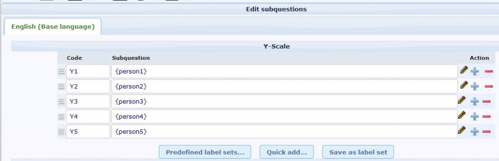 In the survey participants are supposed to name 5 different people (each as question type: free text) and answer some questions about them (e.g. gender, how they relate to the participant, and so on… ) In subsequent questions, those persons (= the names that were stated before) shall appear as row labels/ subquestions of an "array"-type question.