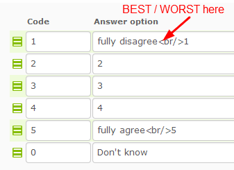 Hi, I was wondering if there was an easy way to display a string such as "Best"/"Worst" in answer fields but actually have LimeSurvey store numbers instead? It sounds simple but I haven't been able to figure out a way to do it. The specific question type I've been using is "array" but if there's a general way to do it for any relevant question type I'm all ears.