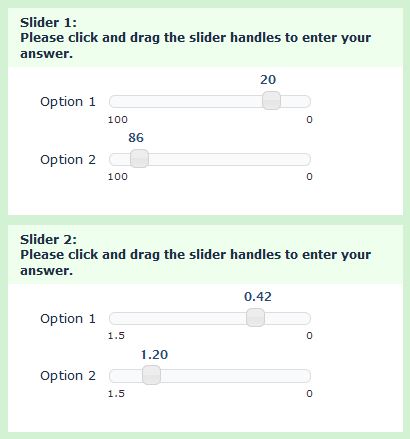 function reverseSlider(qID) { // Identify the question var thisQuestion = $('#question'+qID); //$('span.input', thisQuestion).show() // un-comment this to debug // Reverse the min/max displays $('.answer-item', thisQuestion).each(function(i) { var showMinText = $('.slider-showmin', this).text(); var showMaxText = $('.slider-showmax', this).text(); $('.slider-showmin', this).text(showMaxText); $('.slider-showmax', this).text(showMinText); }); // Initial slider positions $('span.input input[type="text"]', thisQuestion).each(function(i) { if($(this).val() != '') { var thisRow = $(this).closest('li.answer-item'); var thisSlider = $('.ui-slider', thisRow); var sliderValue = $(thisSlider).slider('option', 'max')+$(thisSlider).slider('option', 'min')-$(this).val(); $('.ui-slider', thisRow).slider('option', 'value', sliderValue); $('.slider-callout', thisRow).text($(this).val()); } }); // New slide function $('.ui-slider', thisQuestion).slider( 'option', 'slide', function(event, ui) { // Define a few vars var thisRow = $(this).closest('li.answer-item'); var thisSlider = $(this); var step = $(thisSlider).slider('option', 'step').toString(); var stepDecimals = ''; if(step.indexOf('.') != -1) { stepDecimals = step.length - (step.indexOf('.')+1); } var reverseValue = ''; // Calculate the "reverse" value if(ui.value > $(thisSlider).slider('option', 'max')) { reverseValue = $(thisSlider).slider('option', 'min'); } else if(ui.value < $(thisSlider).slider('option', 'min')) { reverseValue = $(thisSlider).slider('option', 'max'); } else if(stepDecimals > 0) { // Handle decimal places reverseValue = ($(thisSlider).slider('option', 'max')+$(thisSlider).slider('option', 'min')-ui.value).toFixed(stepDecimals); } else{ reverseValue = $(thisSlider).slider('option', 'max')+$(thisSlider).slider('option', 'min')-ui.value; } reverseValue = reverseValue.toString(); reverseValue = reverseValue.replace(/\./,LSvar.sLEMradix); // Load the callout $('.slider_callout', thisRow).text(reverseValue); // Set the data value $('input.text', thisRow).val(reverseValue); $('input.text', thisRow).triggerHandler("keyup"); }); }