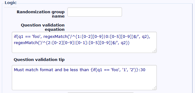 Must match format and be less than {if(q1 == 'foo', '1', '2')}:30