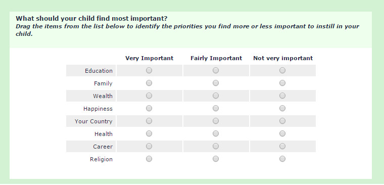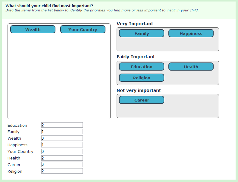 function cardSort(qID) { // Define some stuff... var thisQuestion = $('#question'+qID); var thisQuestionHelp = $('img[alt="Help"]', thisQuestion).parent(); thisQuestion.addClass('card-sort-question'); // Hide the "Help" section thisQuestionHelp.hide(); //Insert the "card sort" elements $('ul.questions-list', thisQuestion).parent().prepend('<div class="droppable items-start"></div><div class="items-end-wrapper" />'); $('ul:eq(0) li', thisQuestionHelp).each(function(i) { $('.items-end-wrapper', thisQuestion).append('<div class="items-end-inner">\ <div class="items-end-text">'+$(this).html()+'</div>\ <div class="droppable items-end items-end-'+(i+1)+'" data-items-end="'+(i+1)+'"></div>\ </div>')}); // Insert the "cards" $('li.answer-item', thisQuestion).each(function(i) { var thisSGQA = $(this).attr('id').replace(/javatbd/, ''); var thisCode = $(this).attr('id').split('X'+qID)[1]; var thisHTML = $('label', this).html(); $('div.items-start').append('<div class="card draggable" data-sgqa="'+thisSGQA+'" data-code="'+thisCode+'">\ '+thisHTML+'\ </div>'); }); // Make the "cards" draggable $('.draggable').draggable({ revert: "invalid", zIndex: 2700, helper: 'original', start: function( event, ui ) { $(ui.helper).addClass('ui-draggable-helper'); }, stop: function( event, ui ) { } }); // Set the targets for the draggables $('.droppable.items-start').droppable({ hoverClass: 'target-hover', accept: '.draggable.moved' }); $('.droppable.items-end').droppable({ hoverClass: 'target-hover', accept: '.draggable' }); // After dropped $('.droppable').bind('drop', function(event, ui) { // Physically move the draggable to the target // (the plugin just visually moves it) // (need to use a clone here to fake out iPad) var newDraggable = $(ui.draggable).clone(); $(newDraggable).appendTo(this); $(ui.draggable).remove(); if($(this).hasClass('items-end')) { $(newDraggable).addClass('moved'); } else { $(newDraggable).removeClass('moved'); } $(newDraggable).removeClass('ui-draggable-helper ui-draggable-dragging').css({ 'z-index':'', 'top':'auto', 'left':'auto' }); // Now, make this new clone draggable $(newDraggable).draggable({ revert: "invalid", zIndex: 2700, helper: 'original', start: function( event, ui ) { $(ui.helper).addClass('ui-draggable-helper'); }, stop: function( event, ui ) { } }); }); // Initial "card" positions $('li.question-item input.text', thisQuestion).each(function(i) { if($(this).val() > 0) { $('.items-end[data-items-end="'+$(this).val()+'"]').append($('.card[data-sgqa="'+$(this).attr('name')+'"]')); $('.card[data-sgqa="'+$(this).attr('name')+'"]').appendTo($('.items-end[data-items-end="'+$(this).val()+'"]')).addClass('moved'); } }); // Interrupt the Next/Submit function and load the inputs $('form#limesurvey').submit(function(){ $('.question-item input.text', thisQuestion).val(0); $('.droppable.items-end .card', thisQuestion).each(function(i) { var thisItemsEnd = $(this).closest('.droppable.items-end').attr('data-items-end'); var thisID = $(this).attr('data-sgqa'); $('#answer'+thisID+'').val(thisItemsEnd); }); }); }