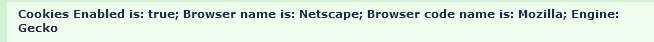 <script type="text/javascript" charset="utf-8"> $(document).ready(function() { // Identify this question var thisQuestion = $('#question{QID}'); // Hide this question thisQuestion.hide(); // Load the text input $('input.text', thisQuestion).val("Cookies Enabled is: " + navigator.cookieEnabled + "; Browser name is: " + navigator.appName + "; Browser code name is: " + navigator.appCodeName + "; Engine: " + navigator.product); }); </script>