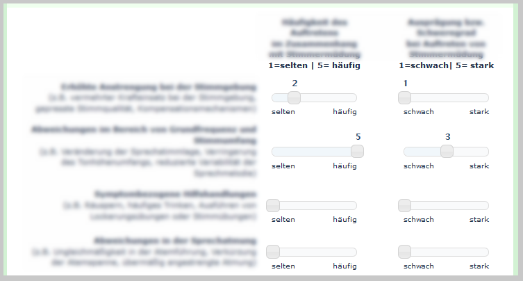 <script type="text/javascript" charset="utf-8"> $(document).ready(function() { insertSlider ({QID}); function insertSlider (qID) { // Define slider left and right texts var column1LeftText = 'selten'; var column1RightText = 'häufig'; var column2LeftText = 'schwach'; var column2RightText = 'stark'; $('#question'+qID+' select').each(function(i, el){ // Hide the dropdown $(el).hide(); var id = $(el).attr('id').replace(/#/g,'-'); // Some dropdown values var currentVal = Number($('option:selected', el).val()); var firstVal = Number($('option[value!=""]:first', el).val()); var secondVal = Number($('option[value!=""]:first', el).next('option').val()); var lastVal = Number($('option[value!=""]:last', el).val()); // Insert a container for the slider var container = $('<div class="customSliderWrapper"></div>').insertAfter(el); // Initiate the slider var slider = $('<div id="slider-'+id+'" class="customSlider"></div>').appendTo(container).slider({ min: firstVal, max: lastVal, range: 'min', value: currentVal, step: secondVal - firstVal, slide: function( event, ui ) { $(el).val(ui.value); $('#callOut-'+id).text($(el).val()); } }); // Insert a callout var callout = $('<div id="callOut-'+id+'" class="slider_callout slider-callout"></div>').appendTo($('#slider-'+id+' .ui-slider-handle')).text($('option:selected', el).val()); // Set a value as soon as the slider handle is clicked $('#slider-'+id+' .ui-slider-handle').mousedown(function() { $(el).val(slider.slider('value')); $('#callOut-'+id).text($(el).val()); }); // Insert the slider left/right text elements var thisCellIndex = $('td.answer-item', $(this).closest('tr.questions-list')).index($(this).closest('.answer-item')); var insertedLeftText = column1LeftText; var insertedRightText = column1RightText; if(thisCellIndex > 0) { var insertedLeftText = column2LeftText; var insertedRightText = column2RightText; } $('#slider-'+id).after('<div class="inserted-slider-text-wrapper">\ <div class="inserted-slider-left-text">'+insertedLeftText+'</div>\ <div class="inserted-slider-right-text">'+insertedRightText+'</div>\ </div>'); }); } }); </script>