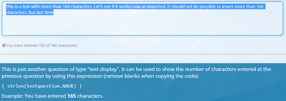 This is a text with more than 160 characters. Let's see if it works now as expected. It should not be possible to insert more than 160 characters, but last time