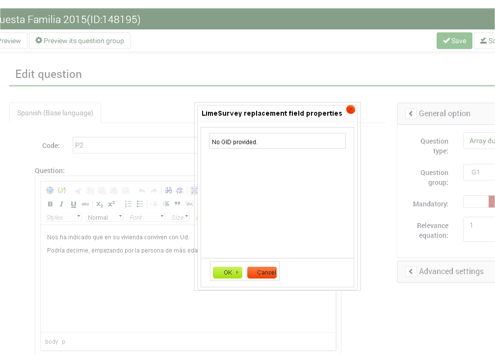 I'm using the version 2.5RC7 Build 160129, and when I want to insert in a question the answer to an earlier question, and I press the button on the "Lime" (LimeSurvey Replacement Properties field), I get an empty box with the message " GID not provided. "